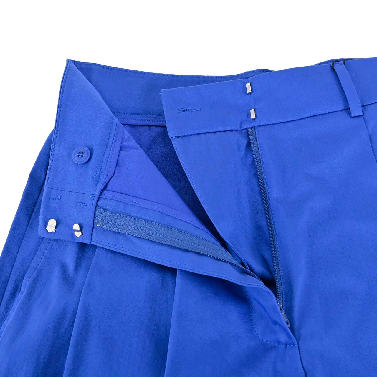 オフィシャルサイトでの紹介コメント フライで覆われたジッパーとホックとバーの留め具に加えて、ダーツのディテールが特徴のワイドフィットのコットン サテン トラウザーズ。フロントにスラントポケット、リアにウェルトポケット。