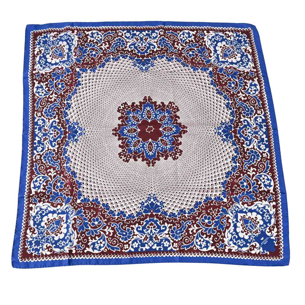 鮮やかなブルーにボルドーが映える、オリエンタルな雰囲気漂うシルクスカーフ。緻密なアラベスク調の模様とフラワーモチーフが、コーディネートに上品な華やぎと奥行きを与えます。シルクならではの滑らかな肌触りと美しい光沢が高級感を演出。首元はもちろん、バッグやヘアアクセとしても使えるマルチなサイズ感で、シンプルな装いのアクセントに最適です。