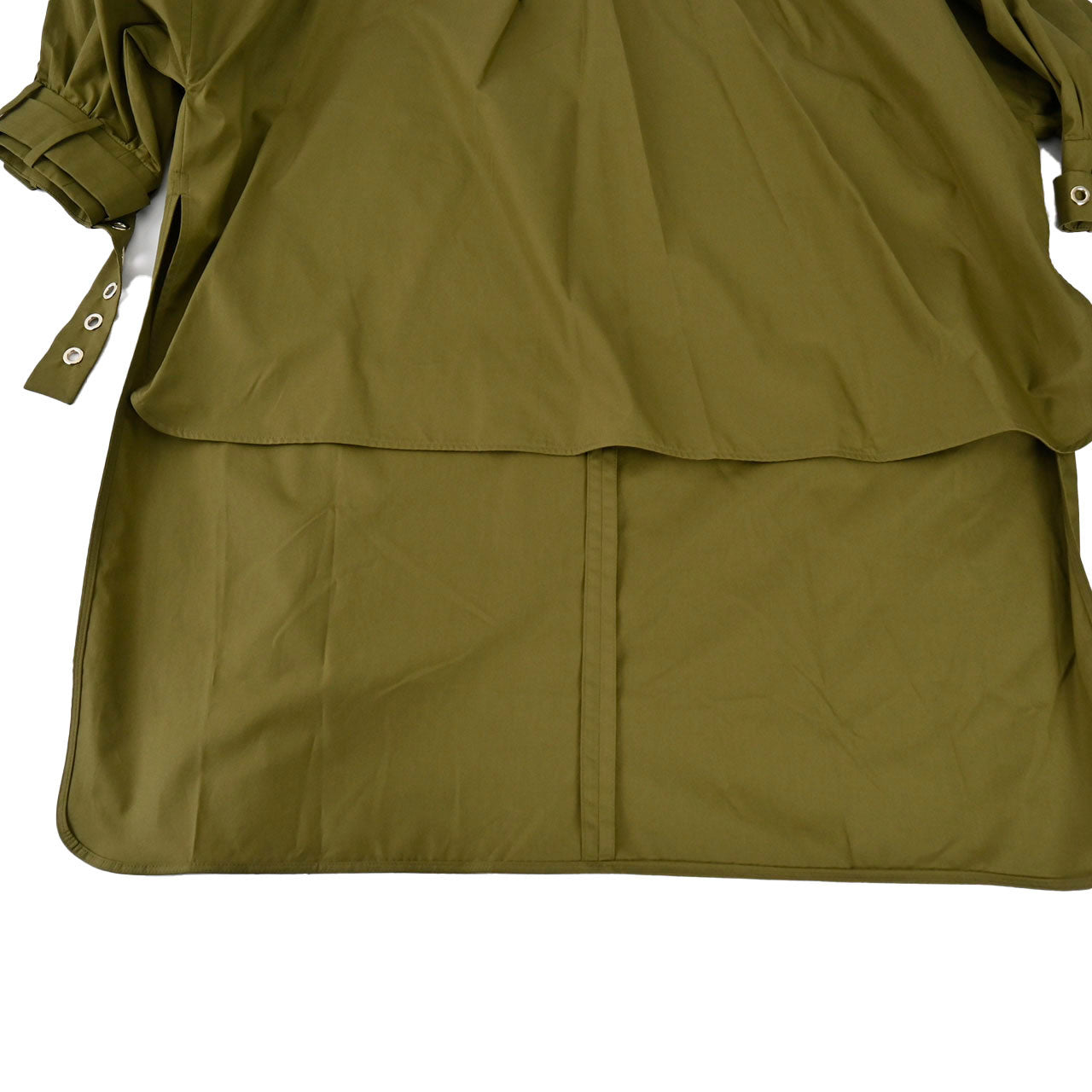 海外オフィシャルサイトでの紹介コメント 『ピュアコットンポプリンを使用した、リラックスフィットのアシンメトリーシャツ。オーバーサイズのボリュームで、クルーネック、ドロップショルダーの七分丈の袖、カバー付きバックルとメタルアイレット付きのベルトが特徴です。後ろが長めのストレートヘム、ラウンドしたサイドスリット、ネックラインのギャザーで仕上げています。背面に目に見えないジッパー開閉』