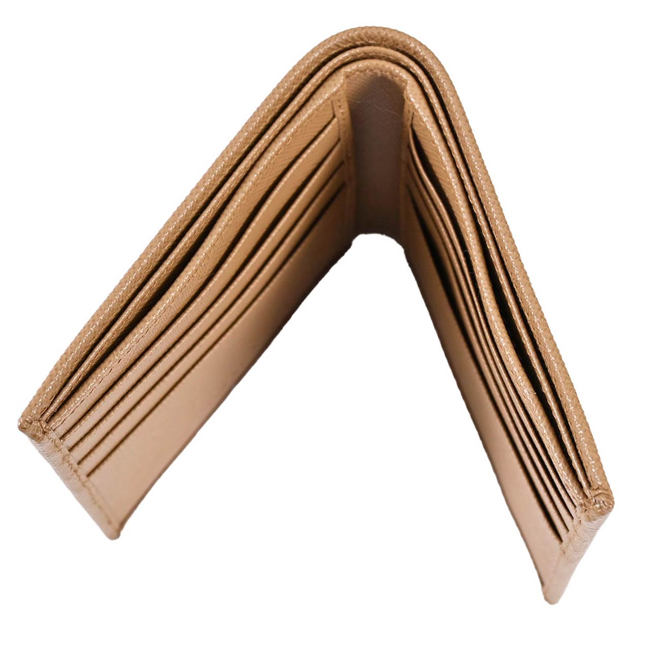 洗練されたキャメルカラーが品格を高める二つ折り財布。細かな型押しを施した上質なレザーは傷や汚れに強く、美しさを長く保ちます。 コーナーに配したトライアングルロゴがミニマルなデザインに確かな存在感をプラス。スリムなフォルムながら複数のカードスロットを備え、機能性も充実。手にするたびに上質さを実感できる、大人のためのスマートな逸品です。