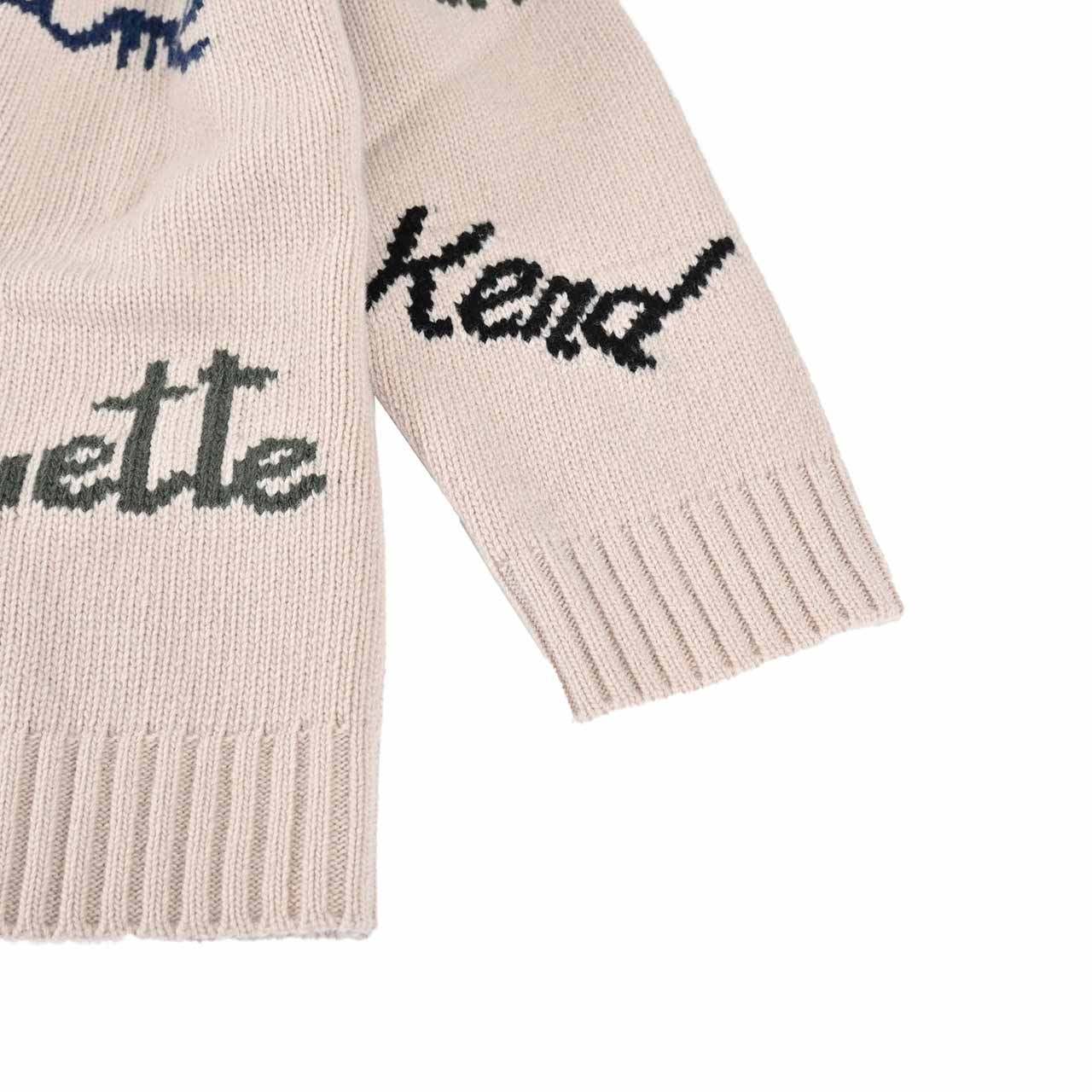 柔らかなベージュを基調としたボディに、「WeeKend」「Bonjour」「Baguette」「croque madame」といったフランス語のメッセージや、可愛らしいモチーフが散りばめられたユニークな一枚です。手書き風のフォントやモチーフが、大人のカジュアルスタイルにこなれた印象を加えます。