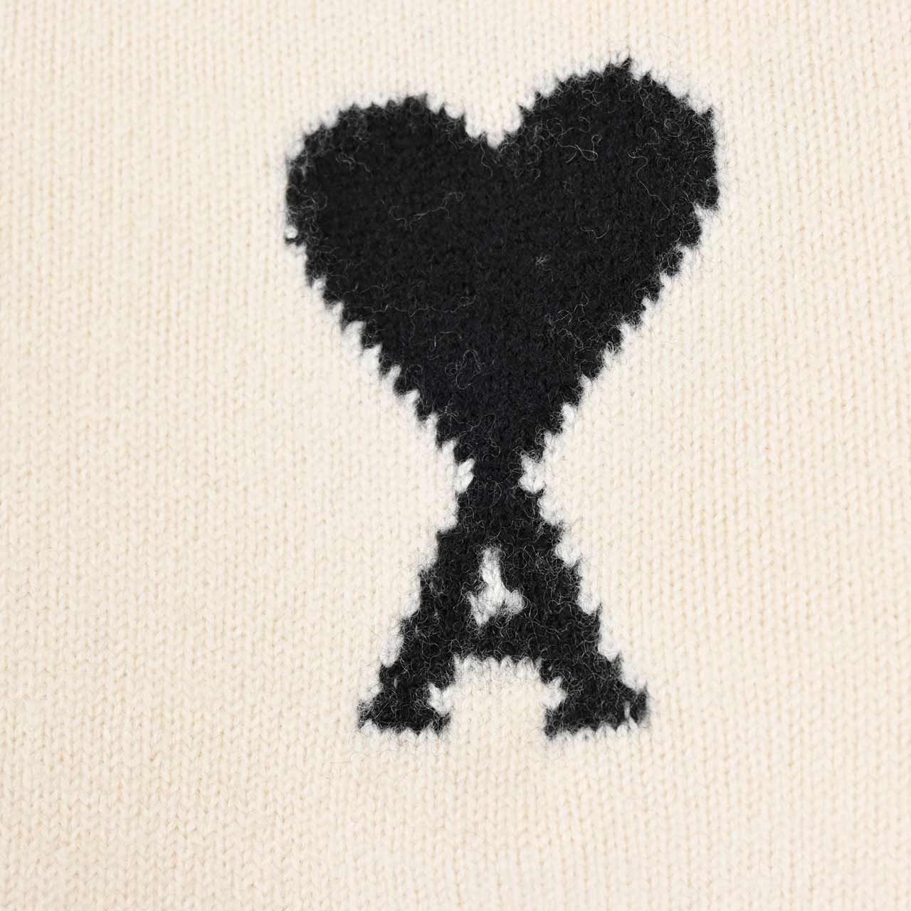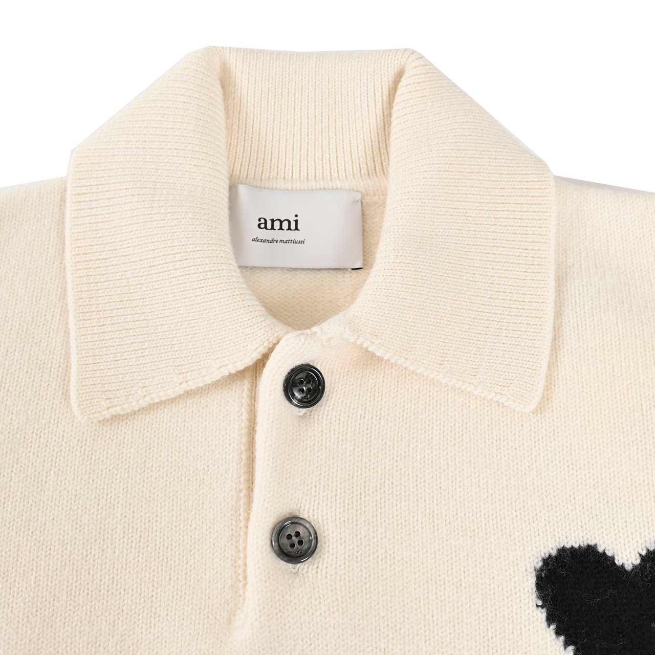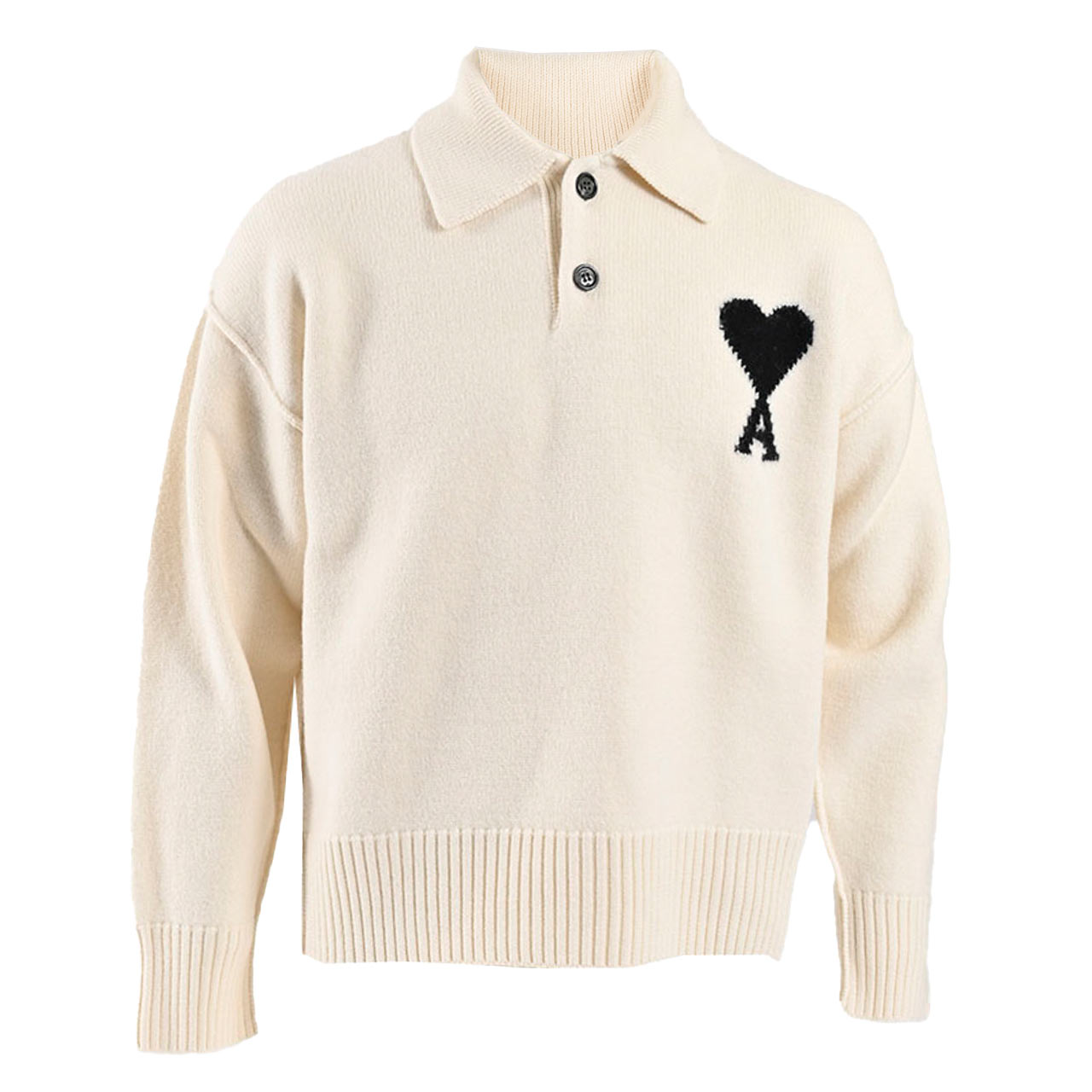 クラシックなポロカラー(襟付き)と比翼仕立ての3つボタンが特徴。左胸には、ブランドの象徴である**「Ami de Coeur」**ロゴをインターシャ編みで配置。控えめながらも確かな存在感を放ち、一目でAMI PARISだとわかるデザインです。