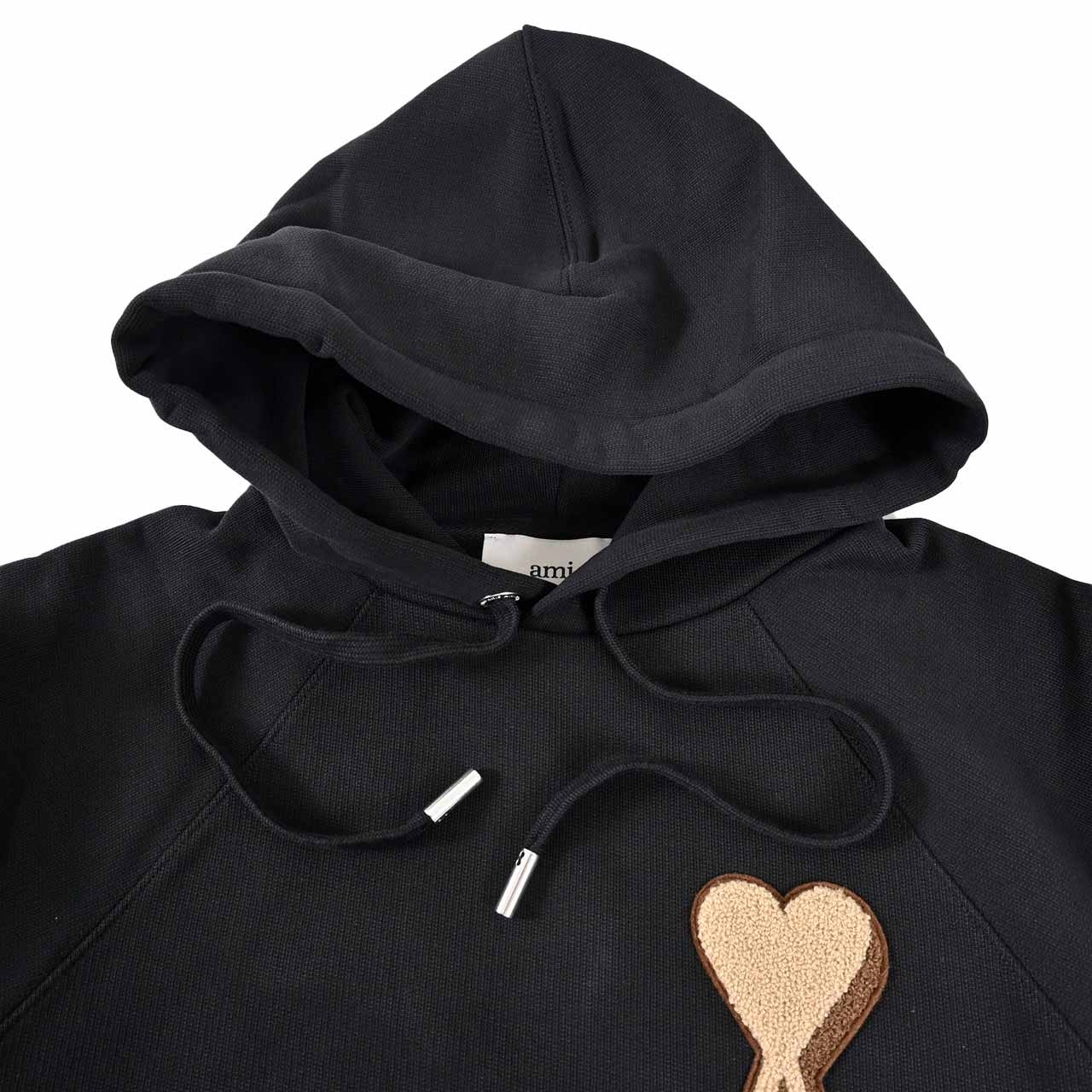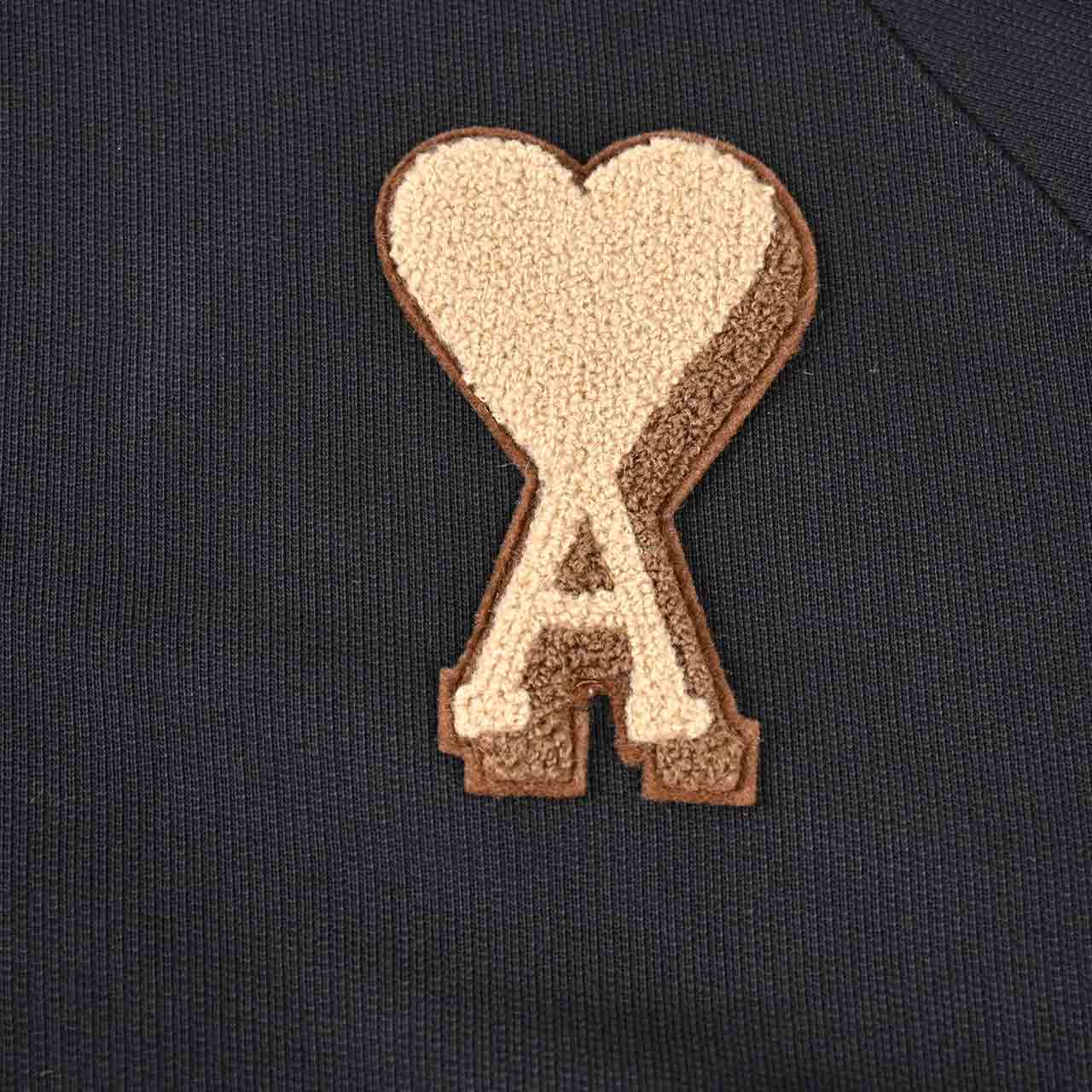 左胸に配された、通常のモデルよりも一回り大きな**「Ami de Coeur(アミ ドゥ クール)」パッチが主役。パッチはボアやパイル**のような立体的なテクスチャ(画像ではベージュ系)で表現されており、シンプルなボディに遊び心と温かみを加えています。