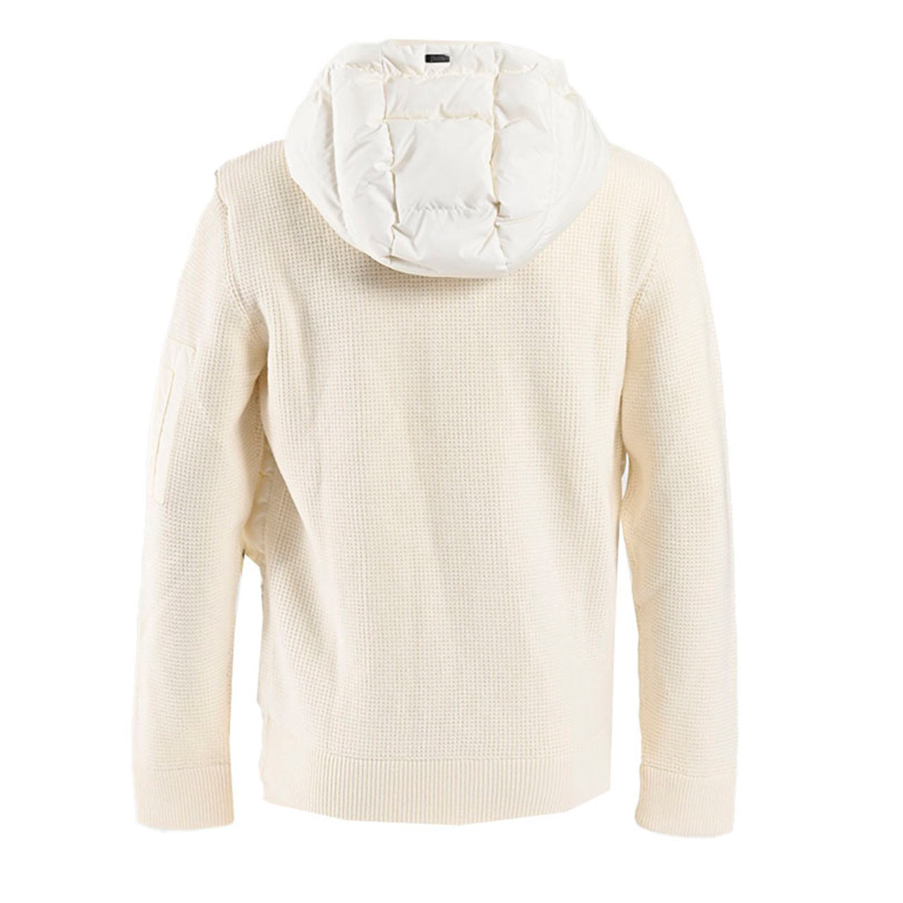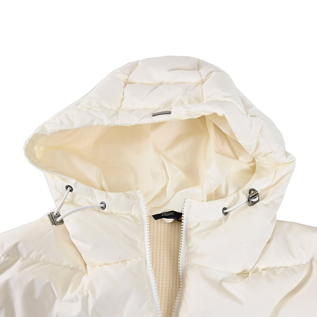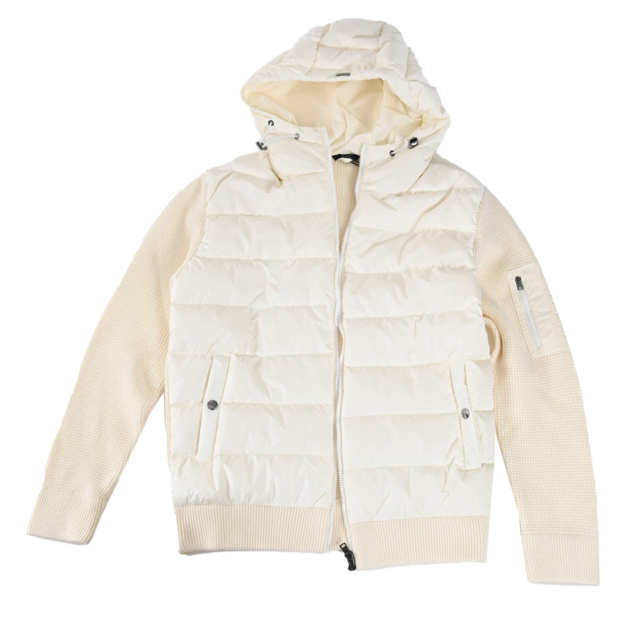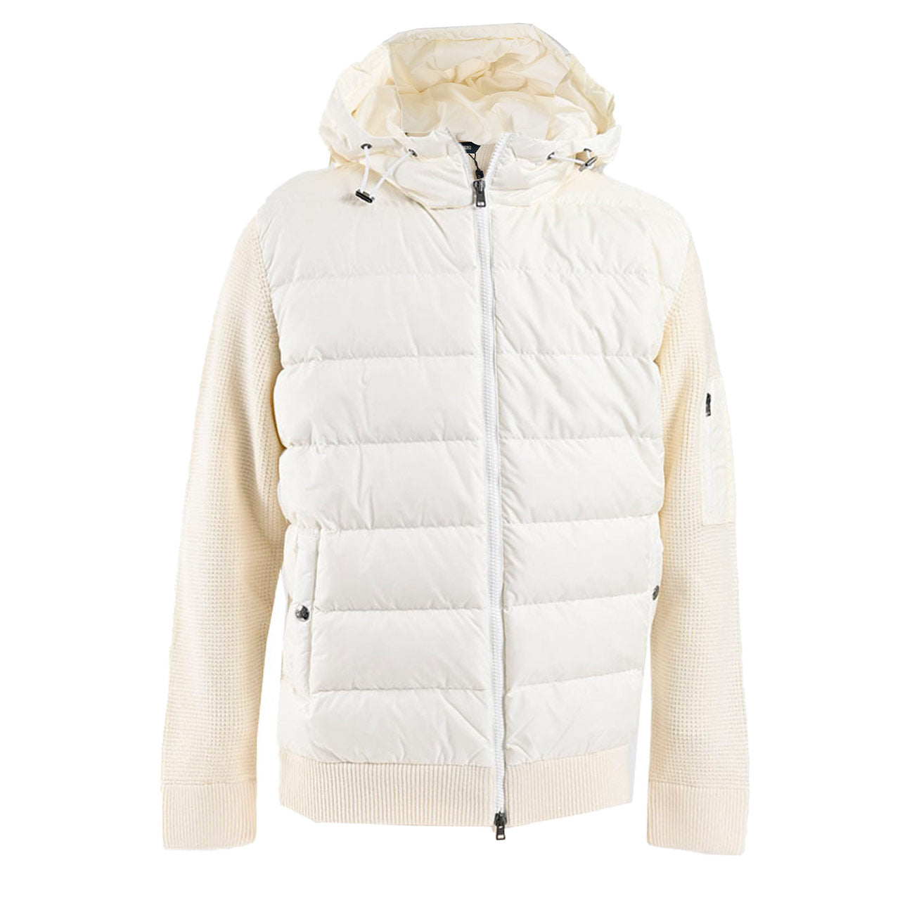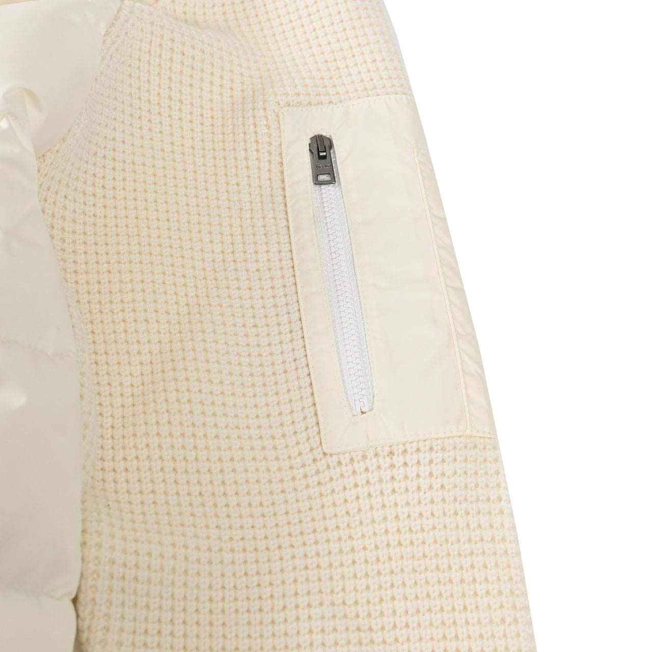 HERNOのハイブリッドトリコットジャケットは、上質なウールにナイロンを組み合わせたテクニカル素材を採用。グースダウンを封入し、軽さと保温性を両立。固定フードやスナップポケット、ジップ仕様が洗練された印象を演出する、都会的なラグジュアリーアウターです。