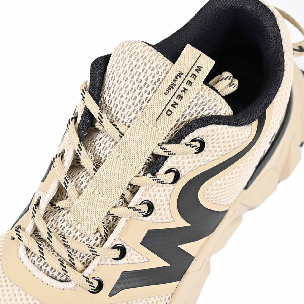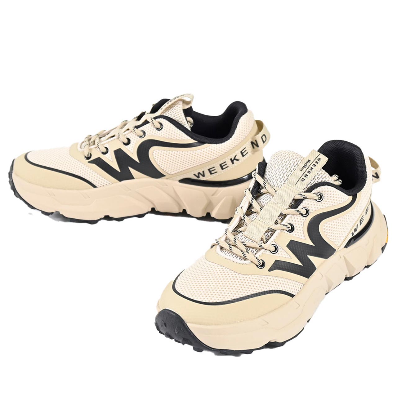 機能美とファッション性を兼ね備えたダッドスニーカー。 ベージュを基調としたニュアンスカラーに、ブラックのアクセントが効いた都会的なデザイン。 サイドにはブランドの頭文字「W」を模したアイコニックなライン、かかと部分には「WEEKEND」のロゴテープがあしらわれ、バックスタイルまで抜かりない一足です。 アッパーは通気性の良いメッシュ素材と、質感の異なるパネルを組み合わせた立体的な仕上がり。 きれいめなスラックスの外しアイテムとしても、スポーティーなレジャーシーンでも主役級の存在感を放ちます。