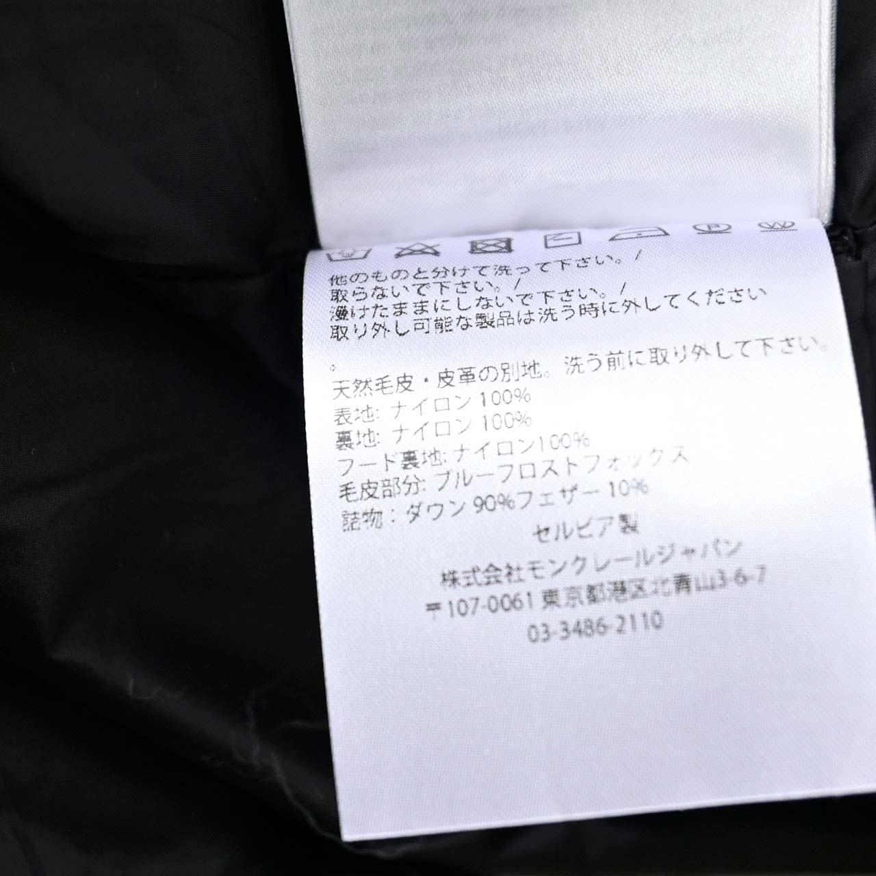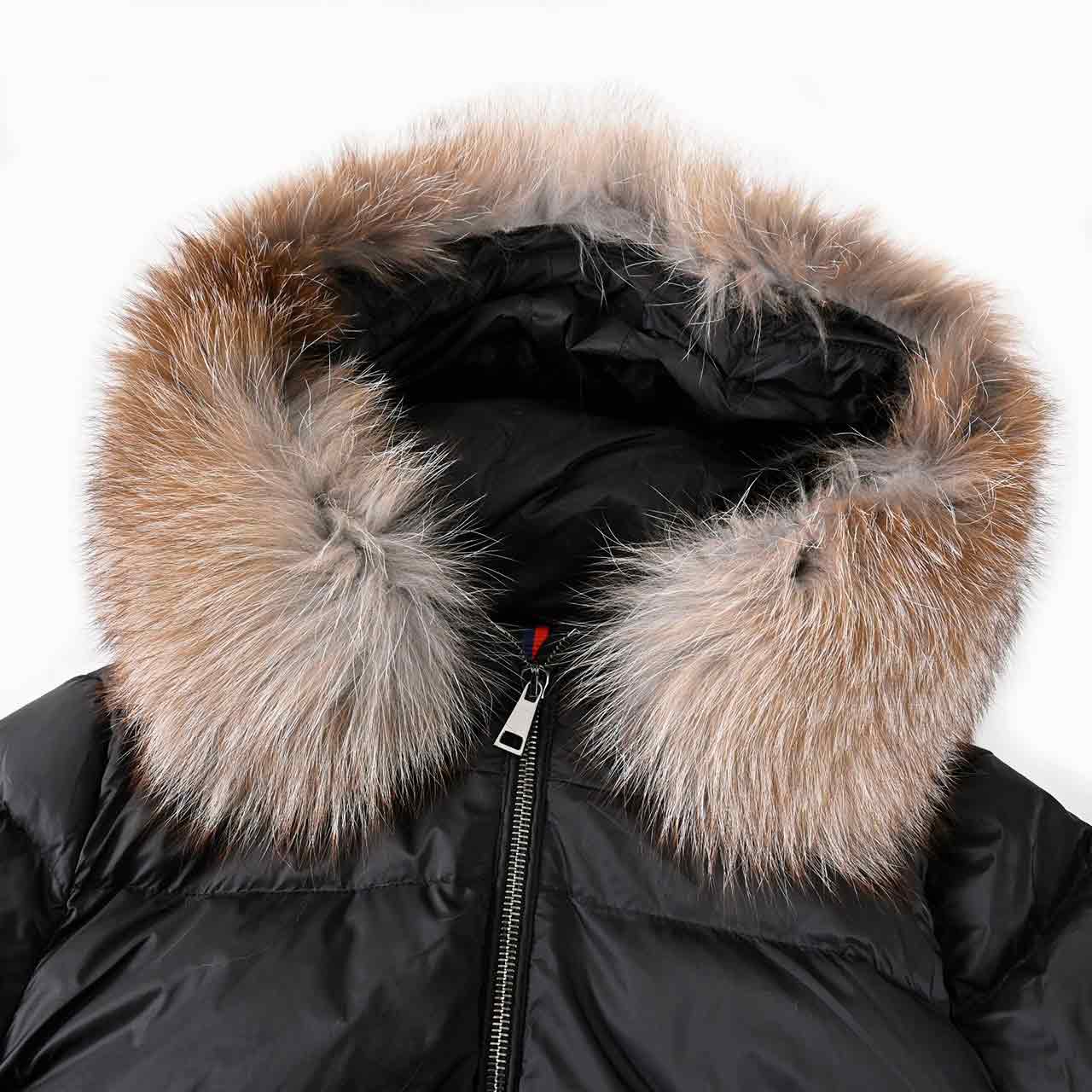 - ナイロン100%、ファー:ブルーフロストフォックス、 ダウン90%、フェザー10%