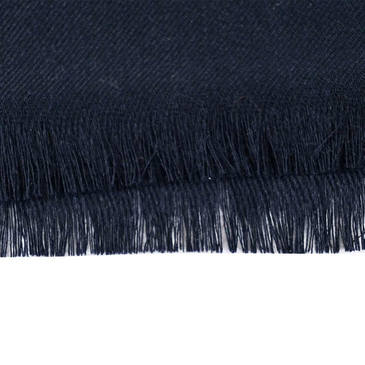 黒に近い深みのあるネイビーが、装いをシックに引き締めるストール。ウールにシルクをブレンドした上質な生地は、しなやかな落ち感となめらかな肌触りが魅力。サイドにあしらわれたライン状のロゴが都会的なアクセントとなり、巻くだけで洗練された印象を与えてくれます。程よいサイズ感で首元にボリュームを出したり、肩からラフに羽織ったりとアレンジも自在。繊細なフリンジが軽やかさを添え、幅広いシーンで活躍する一枚です。