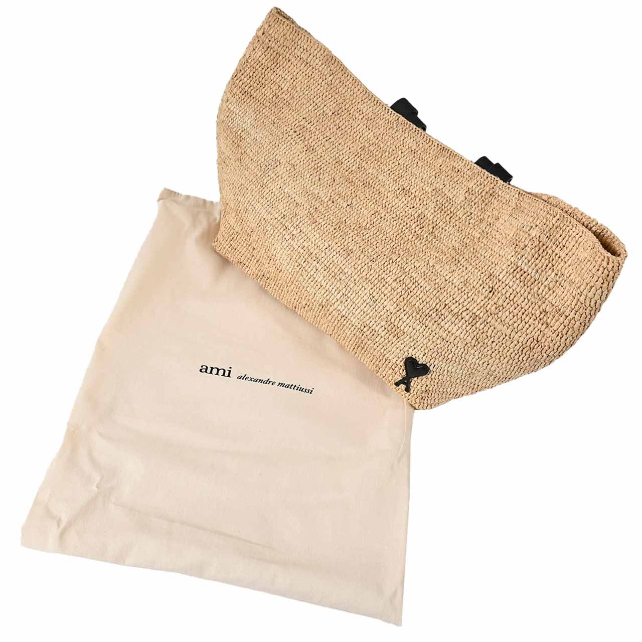 ナチュラルなラフィア調素材を使用した、夏らしい軽やかなバスケットバッグです。フロントには象徴的な「Ami de Coeur」のブラックパッチを配し、ミニマルながらも確かな存在感を放ちます。手持ちのレザーハンドルが全体の印象を引き締め、カジュアルな素材感に都会的な洗練をプラス。デイリーからリゾートまで幅広く活躍する、メゾンのこだわりが詰まった逸品です。